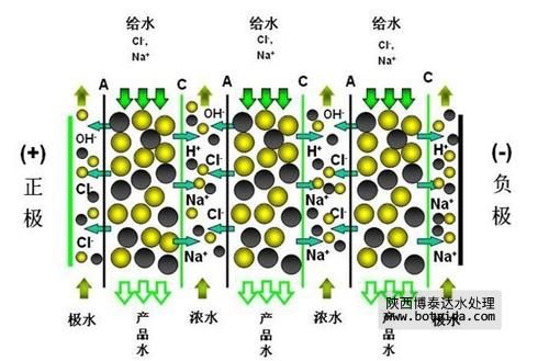 帶負(fù)電荷的陰離子(例如OH-、Cl-)被正極(+)吸引而通過(guò)陰離子交換膜,進(jìn)入到鄰近的濃水室。此后這些離子在繼續(xù)向正極遷移中遇到鄰近的陽(yáng)離子交換膜,而陽(yáng)離子交換膜不允許陰離子通過(guò),這些離子即被阻隔在濃水中。淡水流中的陽(yáng)離子(例如Na+ 、H+)以類似的方式被阻隔在濃水室。在濃水室,透過(guò)陰陽(yáng)膜的離子維持電中性。