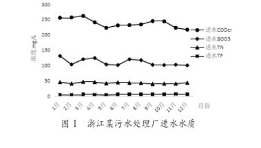 圖1是浙江某污水處理廠的2017年進(jìn)水水質(zhì)。通過分析,全年進(jìn)水COD平均值為240 mg/L,進(jìn)水BOD為111 mg/L,進(jìn)水總氮為43 mg/L,總磷為5.78 mg/L。來水中BOD/COD=0.46/0.45,通過可生化性分析,該進(jìn)水屬于易生化廢水。碳氮比分析中,BOD/TN=2.58;而在日常分析中,碳氮比低至2.0~2.1;相關(guān)研究表明,碳氮比在4~5時,才能有較好的脫氮除磷效果。通過以上分析,本廠的進(jìn)水雖然易生化,但是碳氮比較低,特別是在進(jìn)水碳源較低的情況下,低碳源對于出水穩(wěn)定達(dá)標(biāo)造成一定的風(fēng)險(xiǎn),因此需要外加碳源作為進(jìn)水碳源的補(bǔ)充。