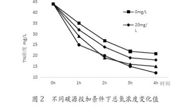 如圖2表示,葡萄糖作為外加碳源,在投加量分別為0、20mg/L、40mg/L和80mg/L情況下,總氮隨時間的變化值??偟S反應(yīng)時間的延長,濃度逐漸降低,最終出水濃度分別為21mg/L、18mg/L、15mg/L和12mg/L。在投加碳源后,系統(tǒng)對脫氮的效果有所提升,對總氮的去除率分別為52%、59%、66%和73%。投加碳源達(dá)到20mg/L后出水滿足《城鎮(zhèn)污水處理廠污染物排放標(biāo)準(zhǔn)》GB18918-2002中的一級B標(biāo)準(zhǔn),而且隨著投加量的增加,系統(tǒng)對總氮的處理效果增強(qiáng)。實(shí)驗(yàn)表明:碳源的投加,保證了硝化細(xì)菌,特別是異養(yǎng)型反硝化細(xì)菌對碳源的需求,提高的脫氮的效果。