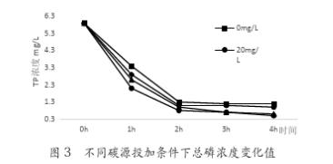 如圖3表示,葡萄糖作為外加碳源,在投加量分別為0、20mg/L、40mg/L和80mg/L情況下,總磷隨時間的變化值??偭纂S反應(yīng)時間的延長,濃度逐漸降低,最終出水濃度分別為1.2mg/L、1.0mg/L、0.6mg/L和0.5mg/L。在投加碳源后,系統(tǒng)對除磷的效果有所提升,對總磷的去除率分別為80%、83%、90%和92%。投加碳源達(dá)到20mg/L后,出水均滿足一級B標(biāo)準(zhǔn),而且隨著投加量的增加,系統(tǒng)對總磷的處理效果增強(qiáng)。