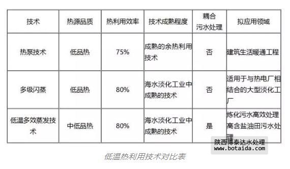 如低溫?zé)崂眉夹g(shù)對(duì)比表所示,較常規(guī)熱泵技術(shù)和多級(jí)閃蒸技術(shù),低溫多效蒸發(fā)在熱利用率、技術(shù)工藝耦合污水處理等方面具有明顯優(yōu)勢(shì),代表了相關(guān)技術(shù)領(lǐng)域的發(fā)展方向,是開展余熱利用和污水處理耦合技術(shù)的重點(diǎn)方向。